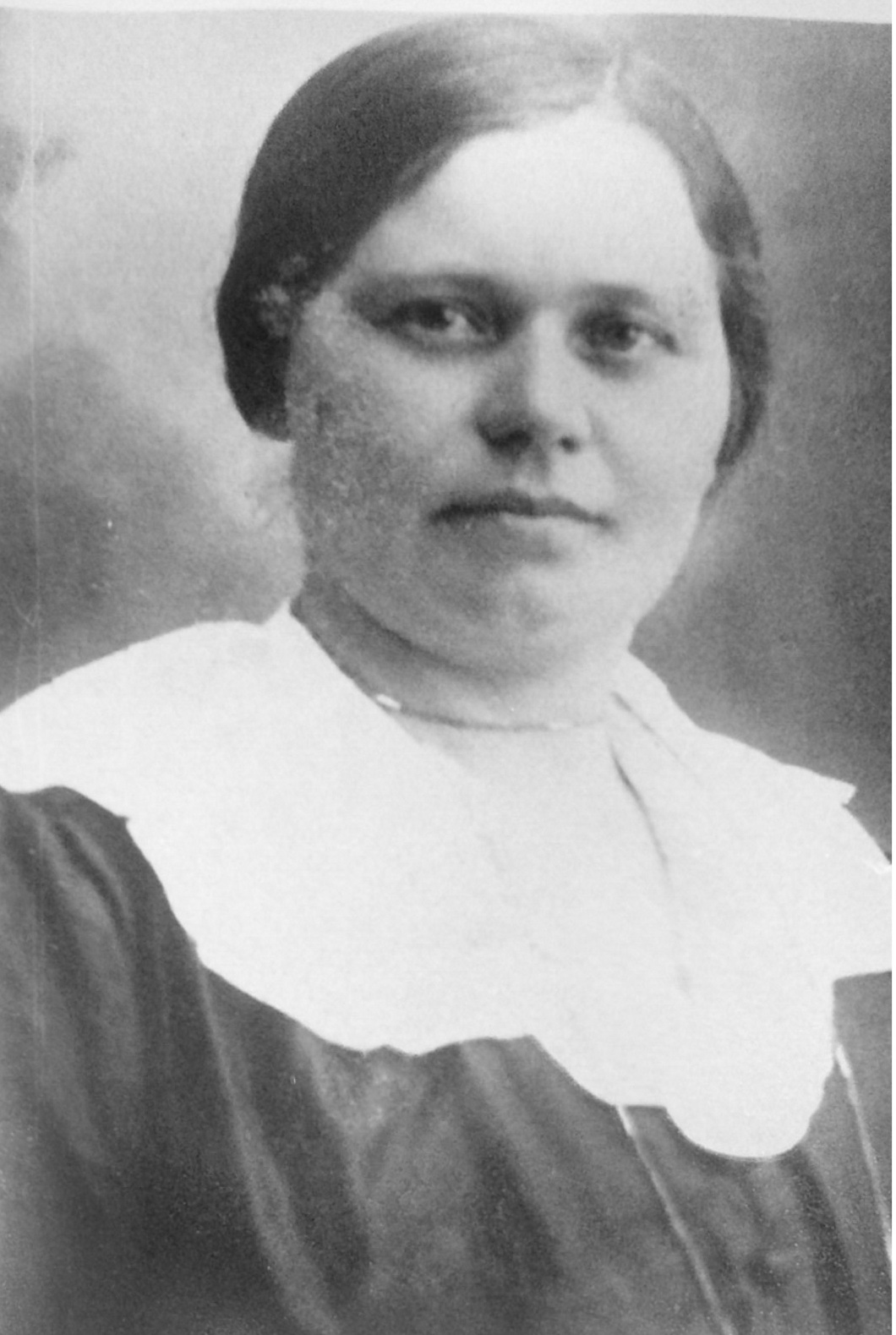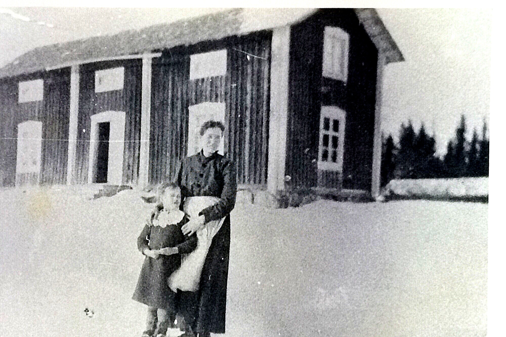 Jenny Vallstedt, född 1876, utanför huset på Önnesmark 7:5 tillsammans med dottern Elsa, född 1912, (8:99)