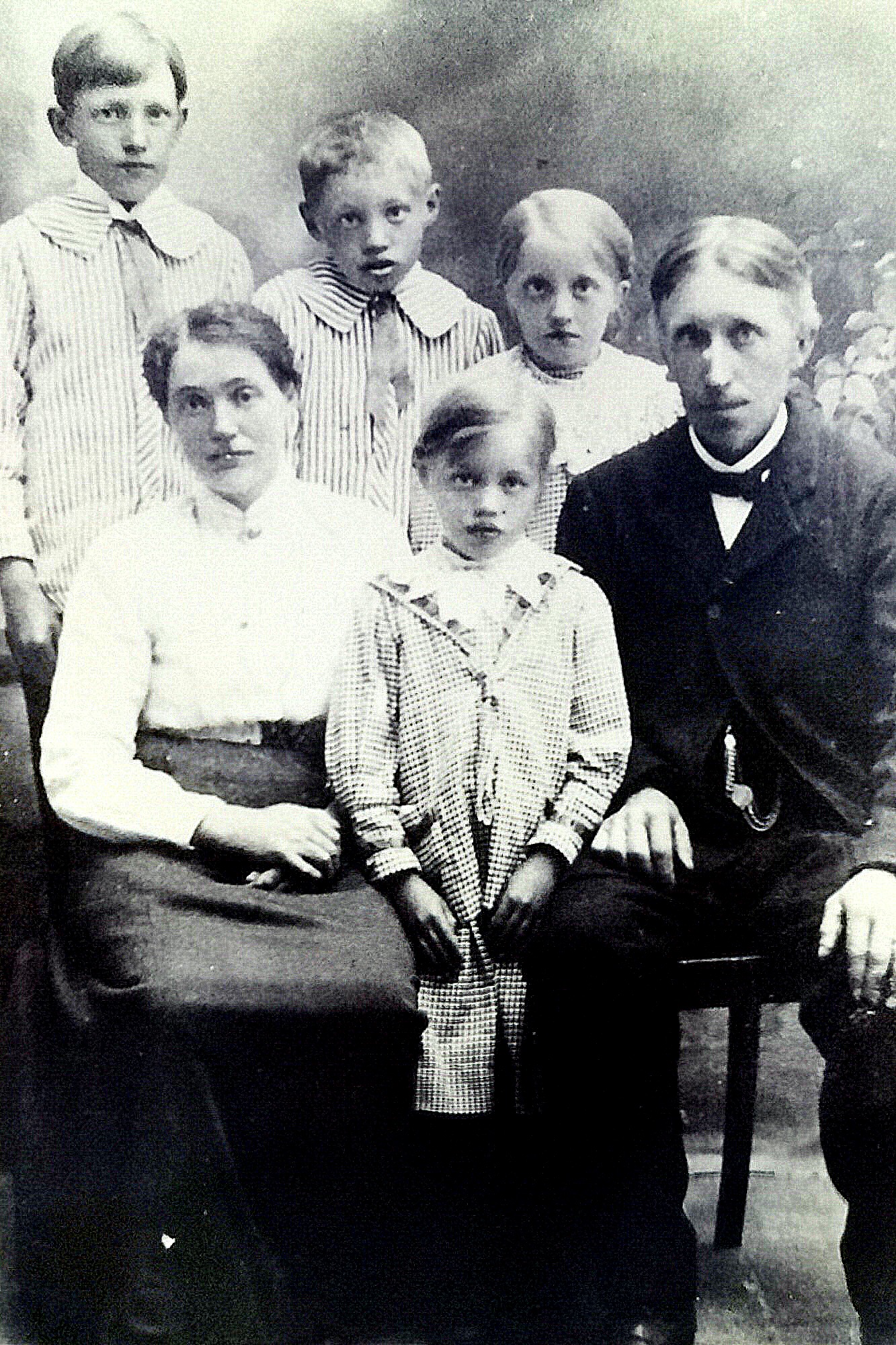 August Vallstedt med familj : August, f 1873. Jenny Kristina Andersson, f 1876, med Henning (1907), Helmer (1908) Svea (1910), Elsa (1912)