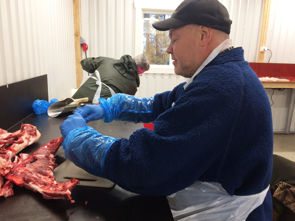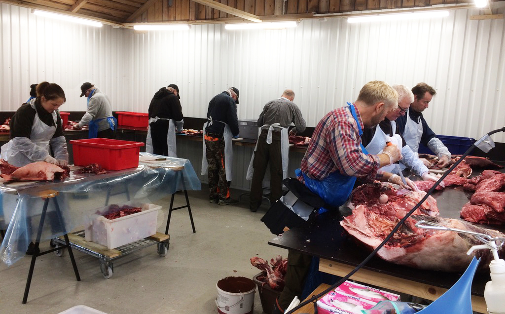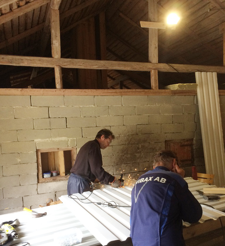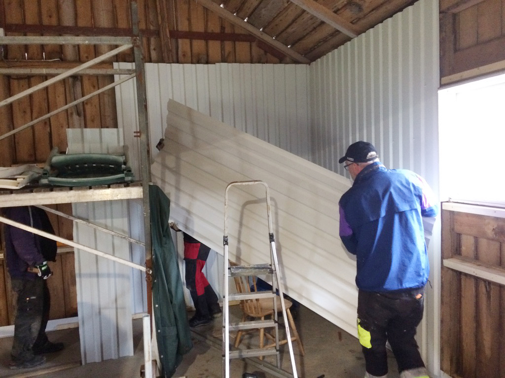 Kylrummet är för tillfället verkstad. Roland och Greger skär till väggplåt.