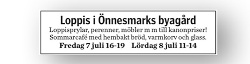 Den 12-13 juli blir det loppis på byagården i Önnesmark. Hör av dig till Birgit Pettersson om du vill boka ett bord. Först till kvarn….