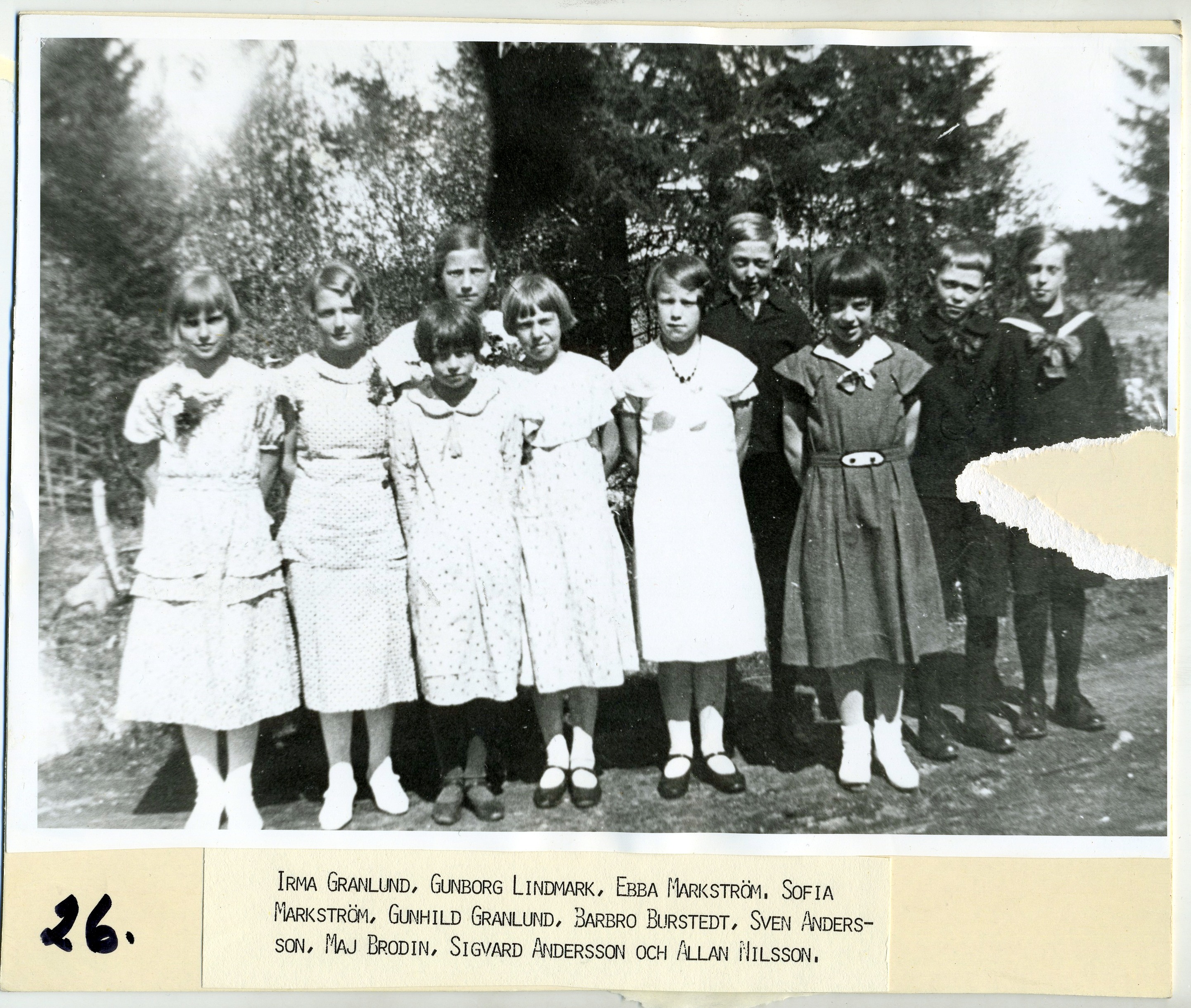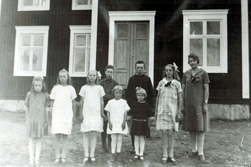 Elever enligt bildtext: Sofia Markström, Sven Andersson, lärarinnan Hilda Edlund, Margit Markström, Sigvard Andersson, Gunhild Granlund,Allan Nilsson, Barbro Burstedt, Ebba Markström, Maj Brodin och Gunborg Lindmark.