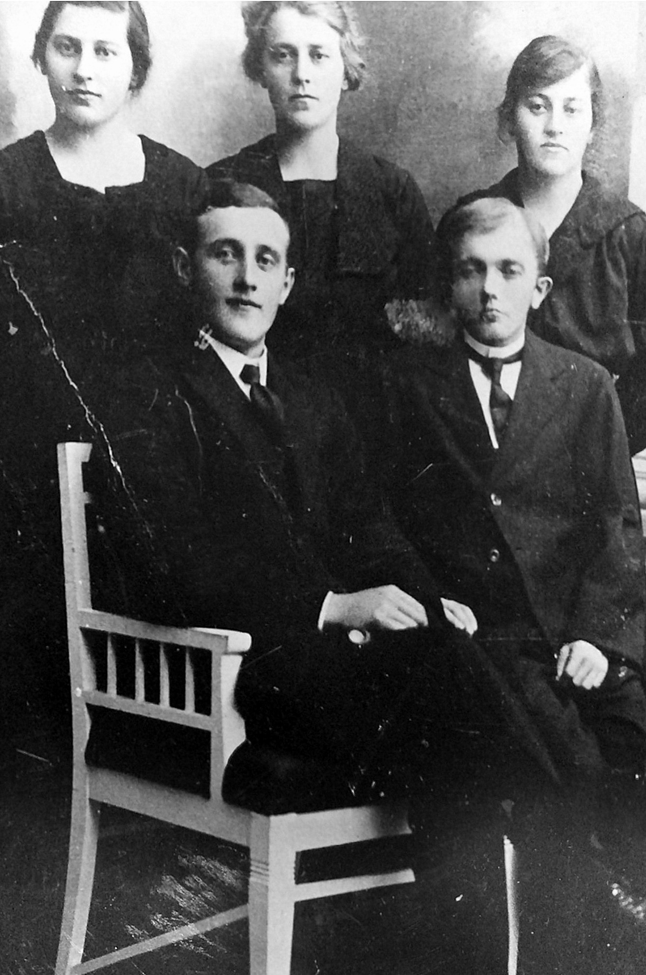 Gunborg Lindmark och Irma Granlund (född 1921). Längst fram: Sven Andersson (född 1922), Barbro Burstedt (född 1922), Ebba Markström (född 1923), Gunhild Granlund (född 1923 samt Allan Nilsson (född 1922). Bild: 2:23