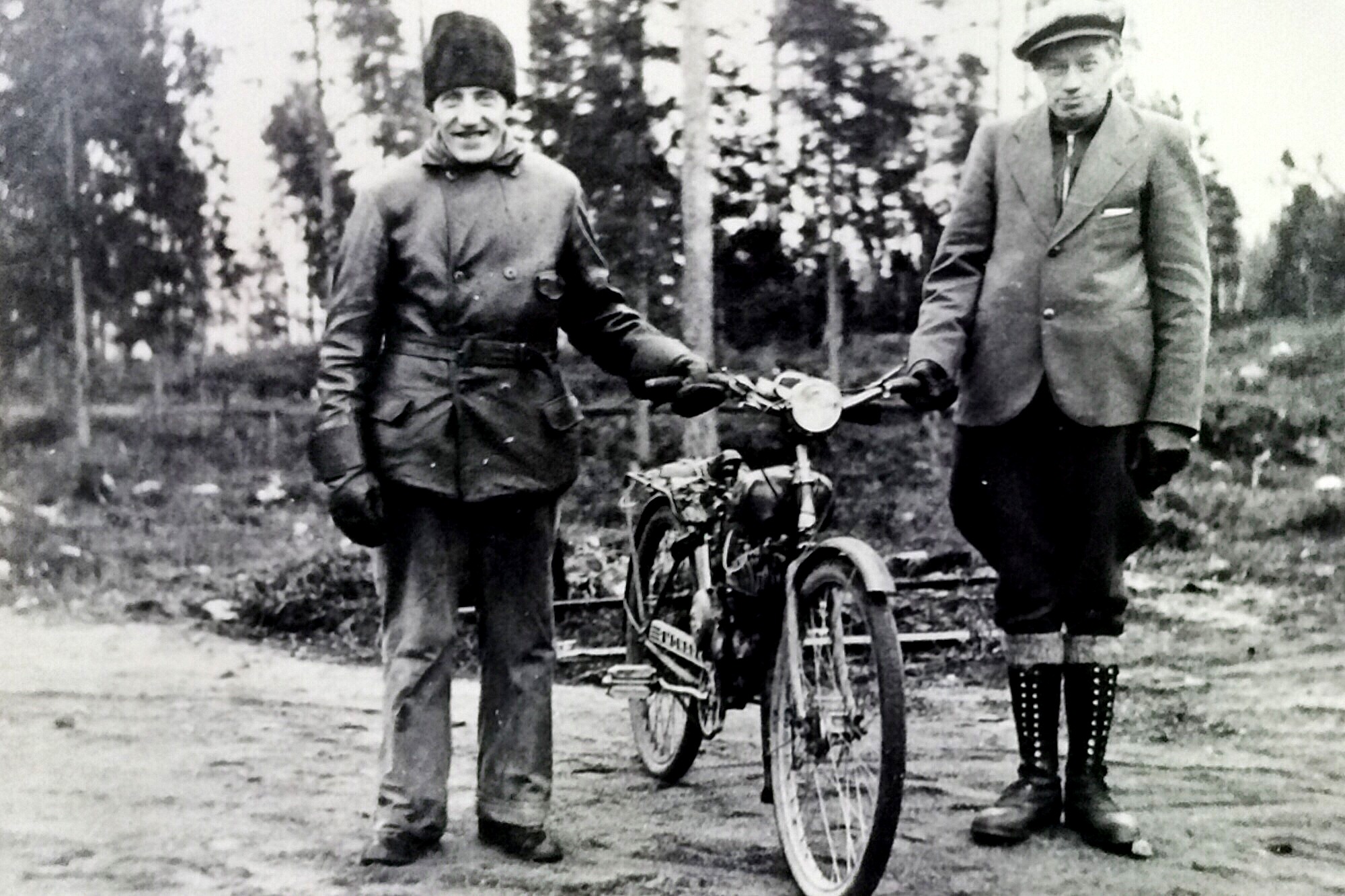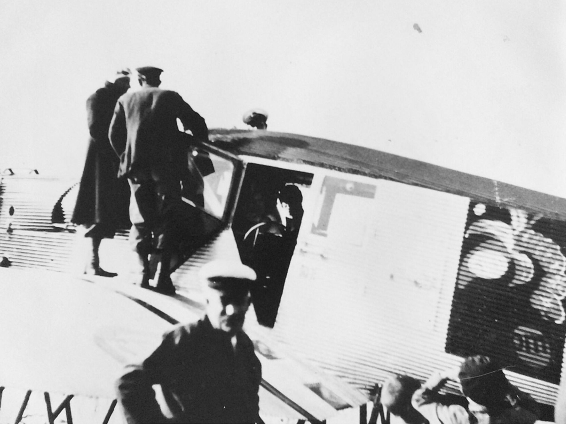 Johan Jansson samtalar med flygaren Albin Ahrenberg Bilden tagen före 1935. Ahrenberg köpte en Junker F13 1923 och flög det fram till 1935 då har kolliderade med ett berg i Vännäs och planet blev till skrot. Gjorde flyg uppvisningar/uppstigningar landet runt.