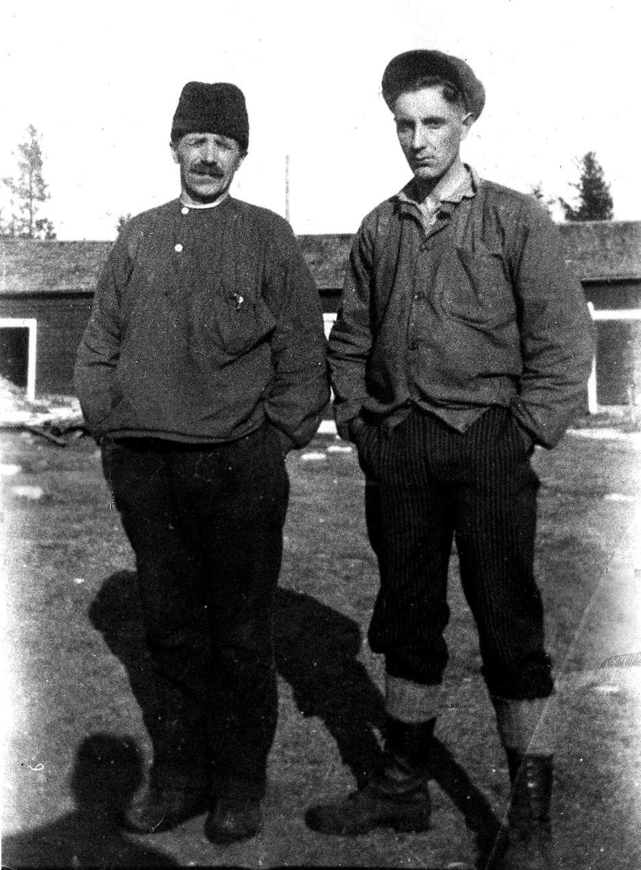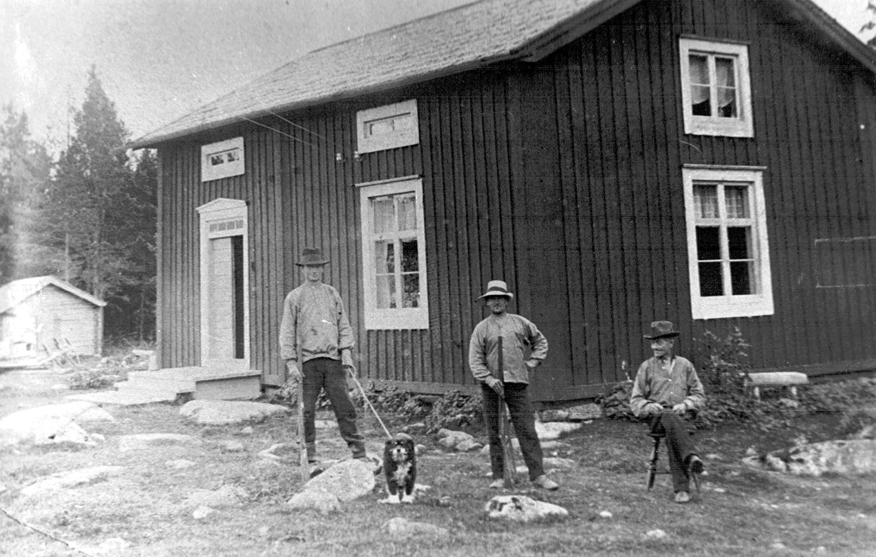 Emil Vallgren, Ragnar Vallstedt och August Vallgren. Bilden är tagen utanför ”bryggstugan” på August Vallgrens gård, Önnesmark 6:5 , i dag Asta Viklund (Bild 4:40)