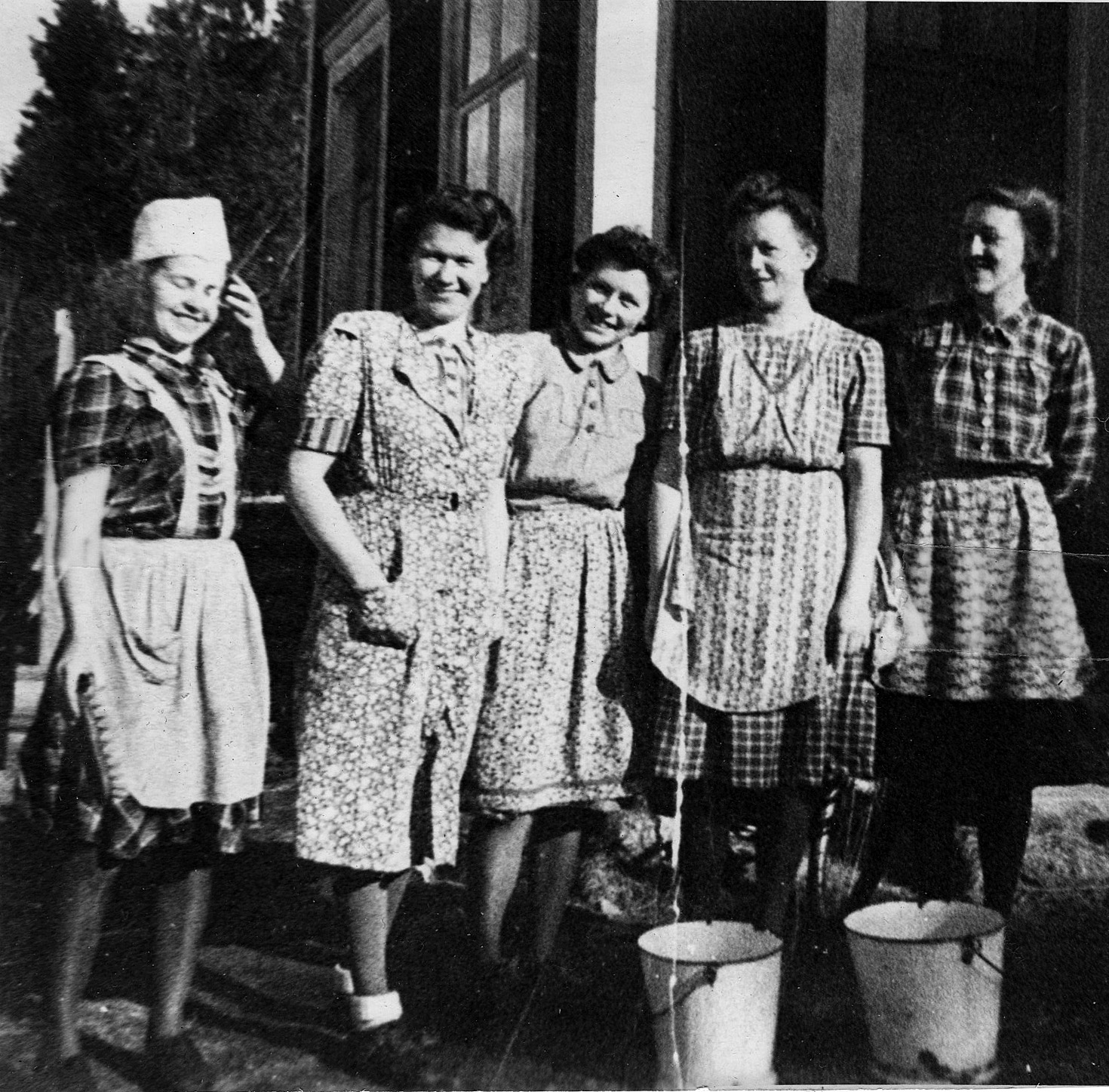 Fem kvinnor vid skolan i Önnesmark. De är arbetsklädda, en håller i en skurborste, två hinkar i förgrunden. Städning, men när? Troligen 1950 eller 1951. Våren 1947 lades skolan ner. Tf v Maine Granlund, Ingeborg Viklund, Ebba Markström, Doris Eriksson och Edith Persson. (Bild 1:10)