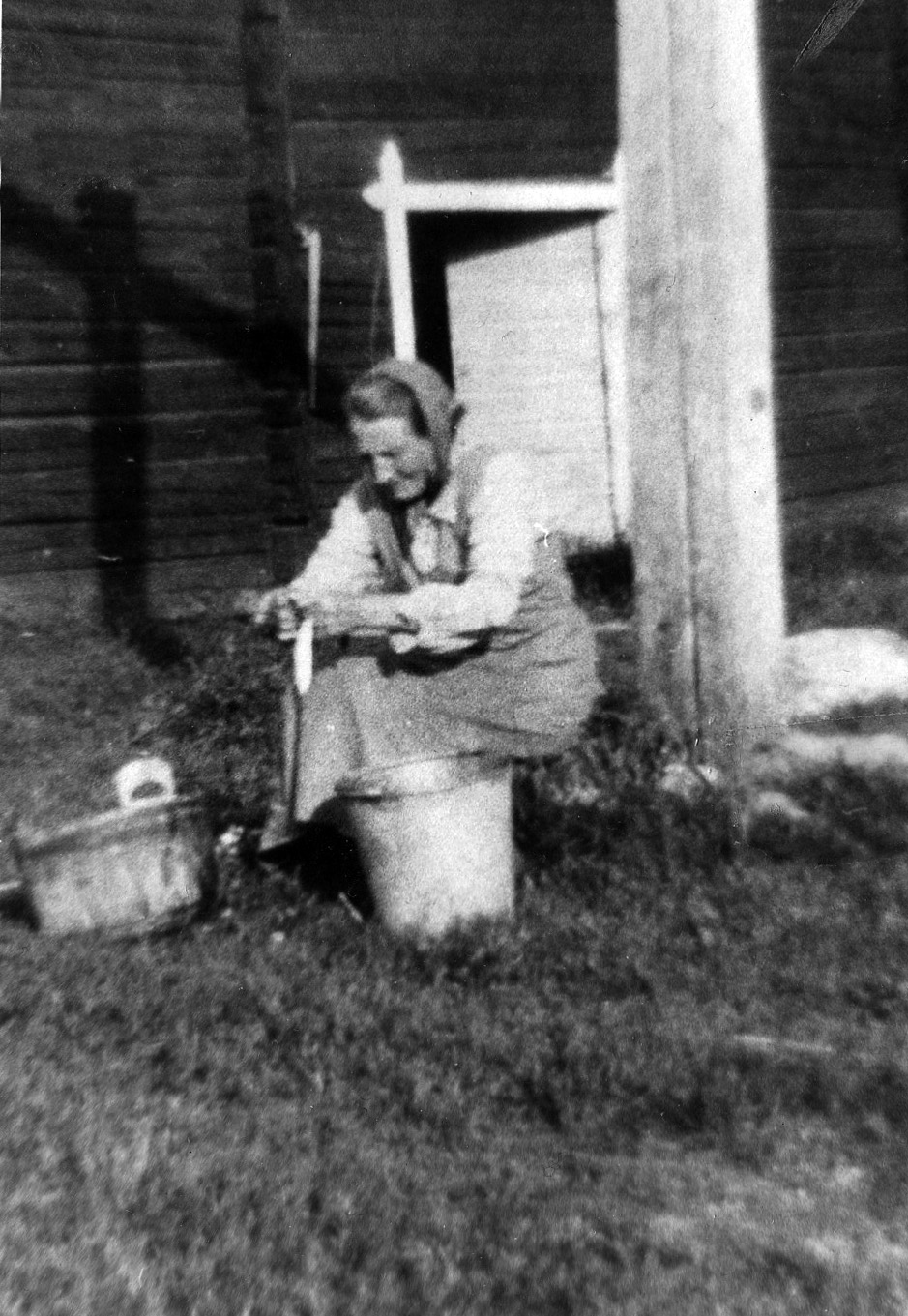 Maja Eriksson silar mjölk utanför ladugården. Bilden är tagen före 1953. Asta Viklkund äger i dag fastigheten Bild 1:7