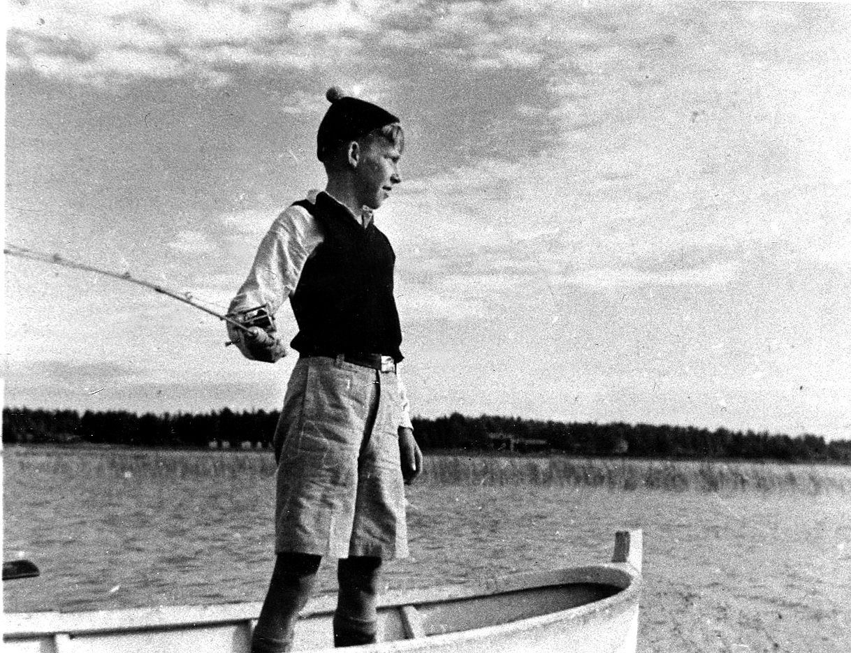 ”Mitt första kast” har Gösta skrivit under denna bild företsällande honom själv när han fiskar från en båt på Önnesmarksträsket. Bild 1:15
