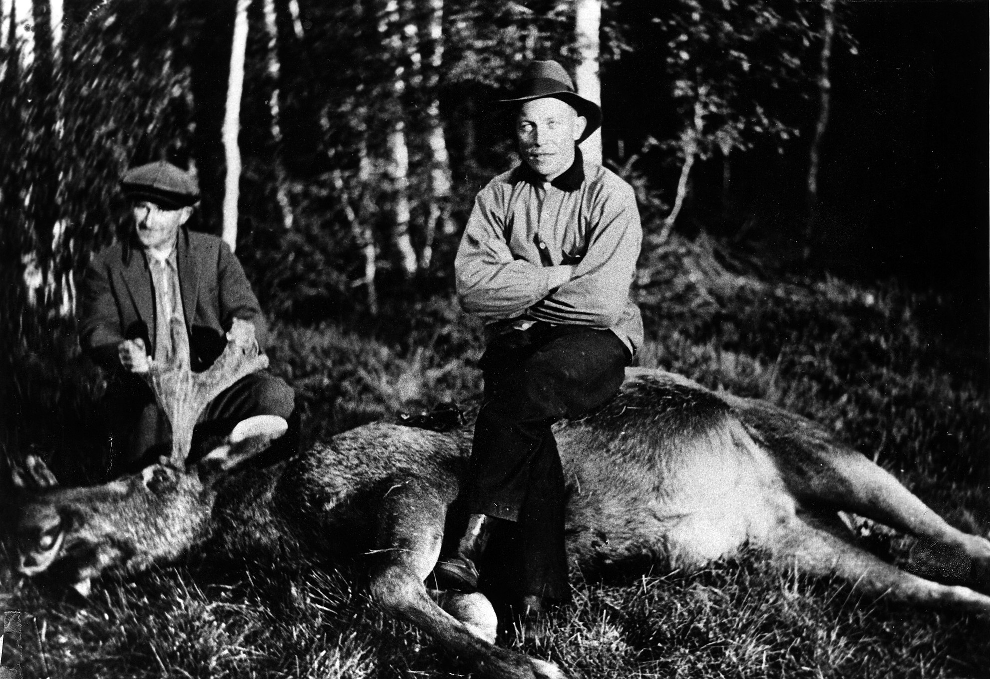 August Vallgren,(född 1845) med två hundar i knät och sonen Emil,(född 1885) med gevär på axeln. Gården, Önnesmark 6;5, ägs idag av Asta Viklund. (Bild 4:36)