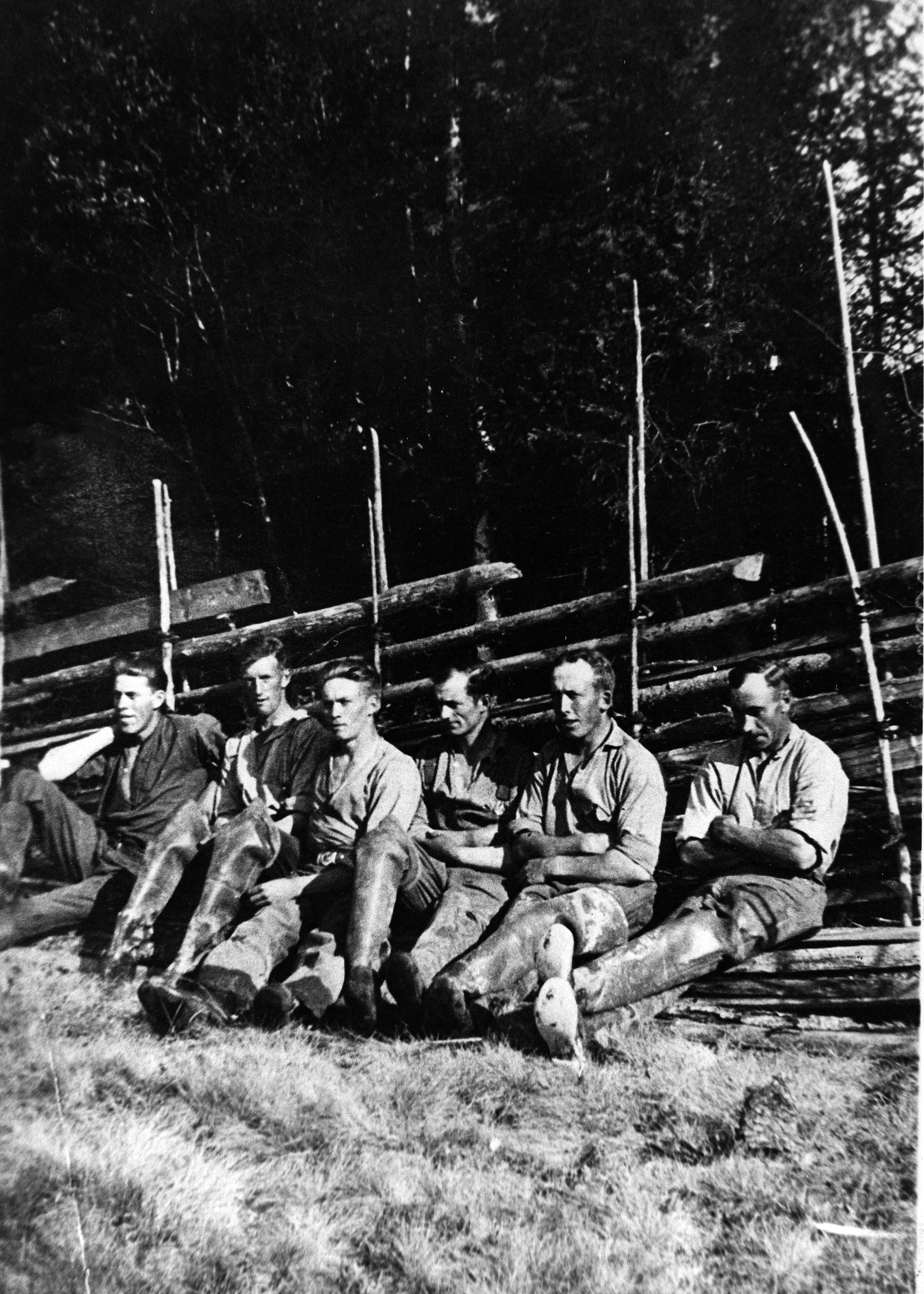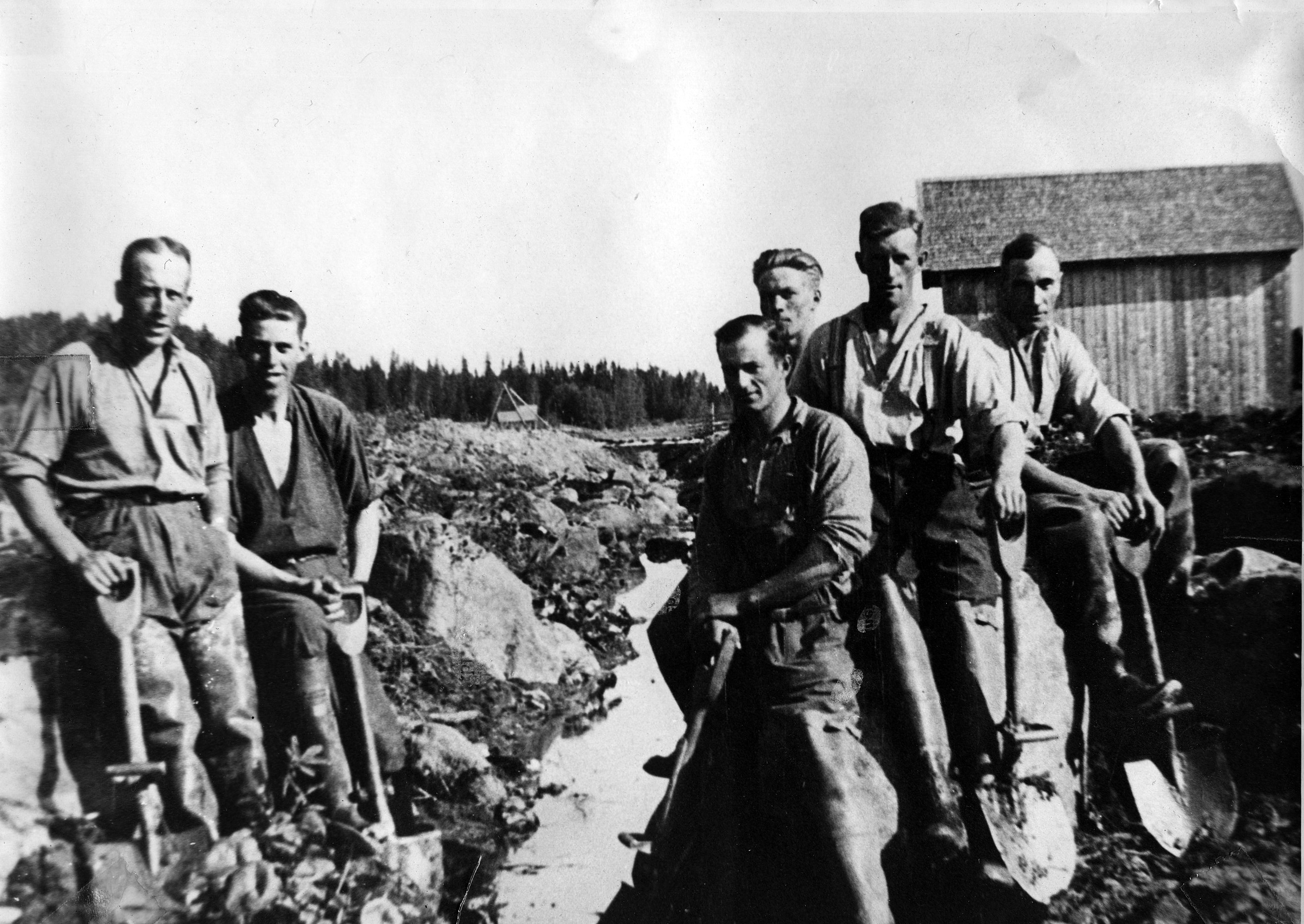 Dikningsgäng: Konrad Söderberg, Fjälbyn, Verner Mattsson, Önnesmark, Sigvard Andersson, Hökmark, Henning Wallstedt, Önnesmark samt Karl Forsman, Lappvik. Bilden är troligen tagen när krondiket mellan Landet och Djupatjän grävdes , troligen i Slyet eller Röjnoret (Bild 1:1)
