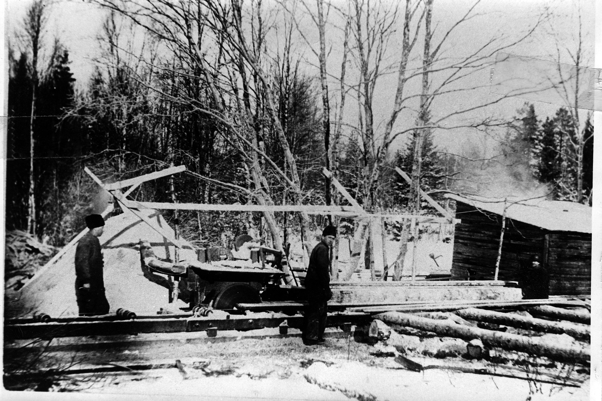 Sågning vid Johan Granlunds såg. Ragnar Wallstedt, Önnesmark, Gunnar Nilsson, Kåsböle, Verner Mattsson, Önnesmark, Algot Lindgren, Önnesmark, Johan Granlund, Önnesmark. Sågen fanns på Grannlunds skifte väster om E4, ca 300 meter in längs gamla kustlandsvägen (infarten till Degerträsket Bild 1:2