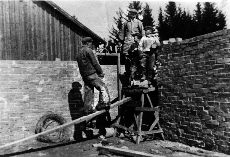 Albert Magnusson, Bodan, bär tegel och på bocken står Johan Granlund tillsammans med Viljo Ilmari Bergman och Ingvar Magnusson (Bil1:4)