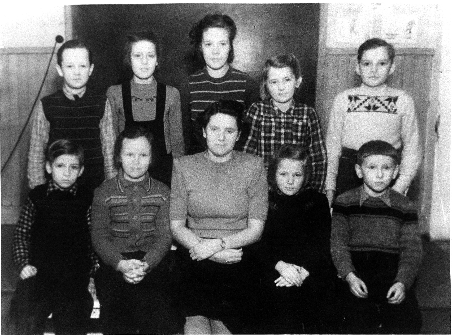 Bilden tagen gissningsvis omkring 1946. Bakre raden: Lars Eriksson, Eivor Lindgren, Inga Käll (född 1934), Naima Andersson (född 1935) samt Sture Granlund (född 1935) Främre raden: Bengt Persson (född 1939), Ellen Larsson (född 1936), fröken Ella Stenvall, Gerd Andersson (född 1937) samt ? Stenvall. Bild 2:22.