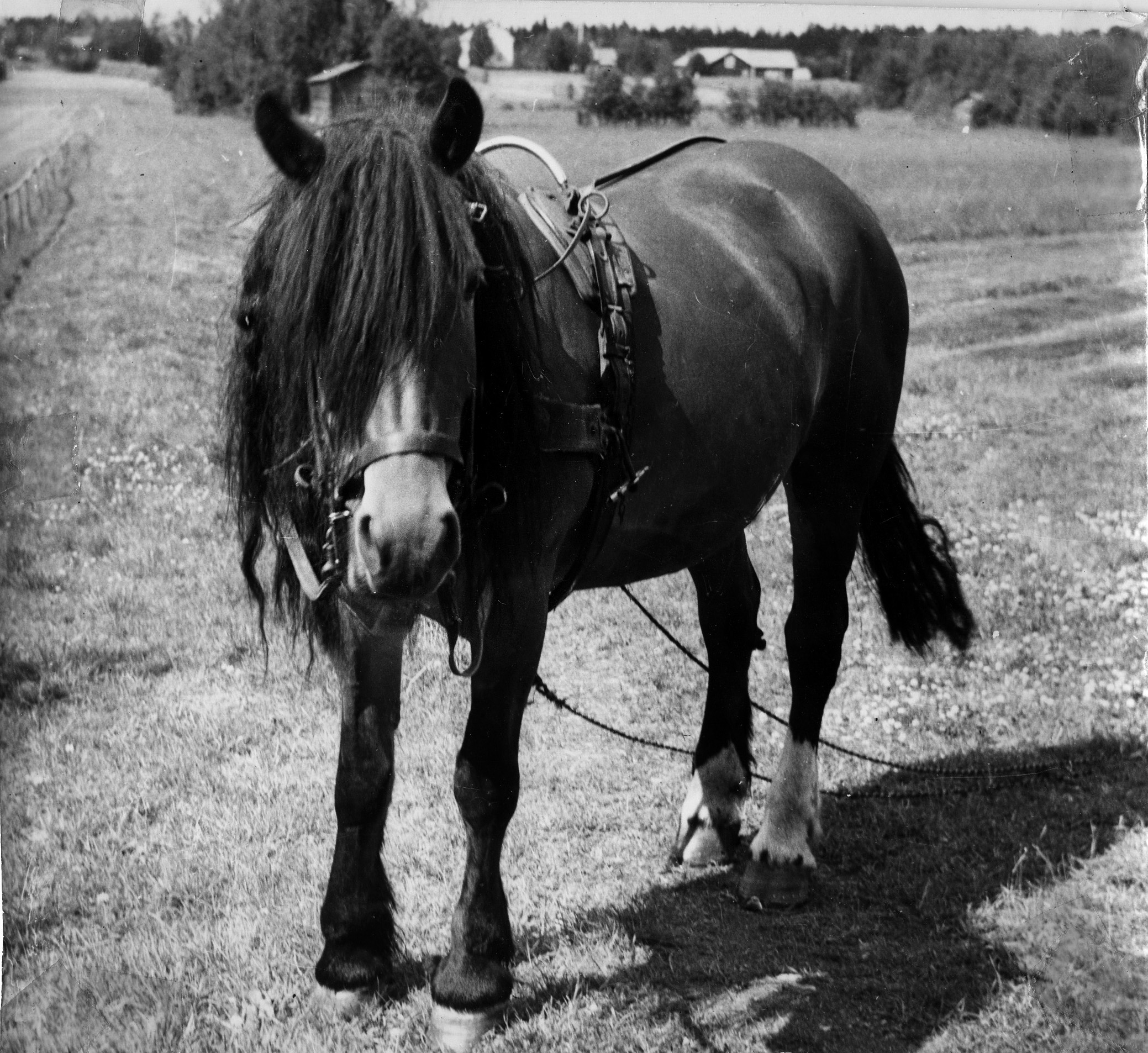 Den siste dragaren i byn? Hästen Molly. Ägare Gösta Granlund. Bilden är tagen vid Arthur Persson Gammgården (Broudden) När togs bilden? Bild 1:9