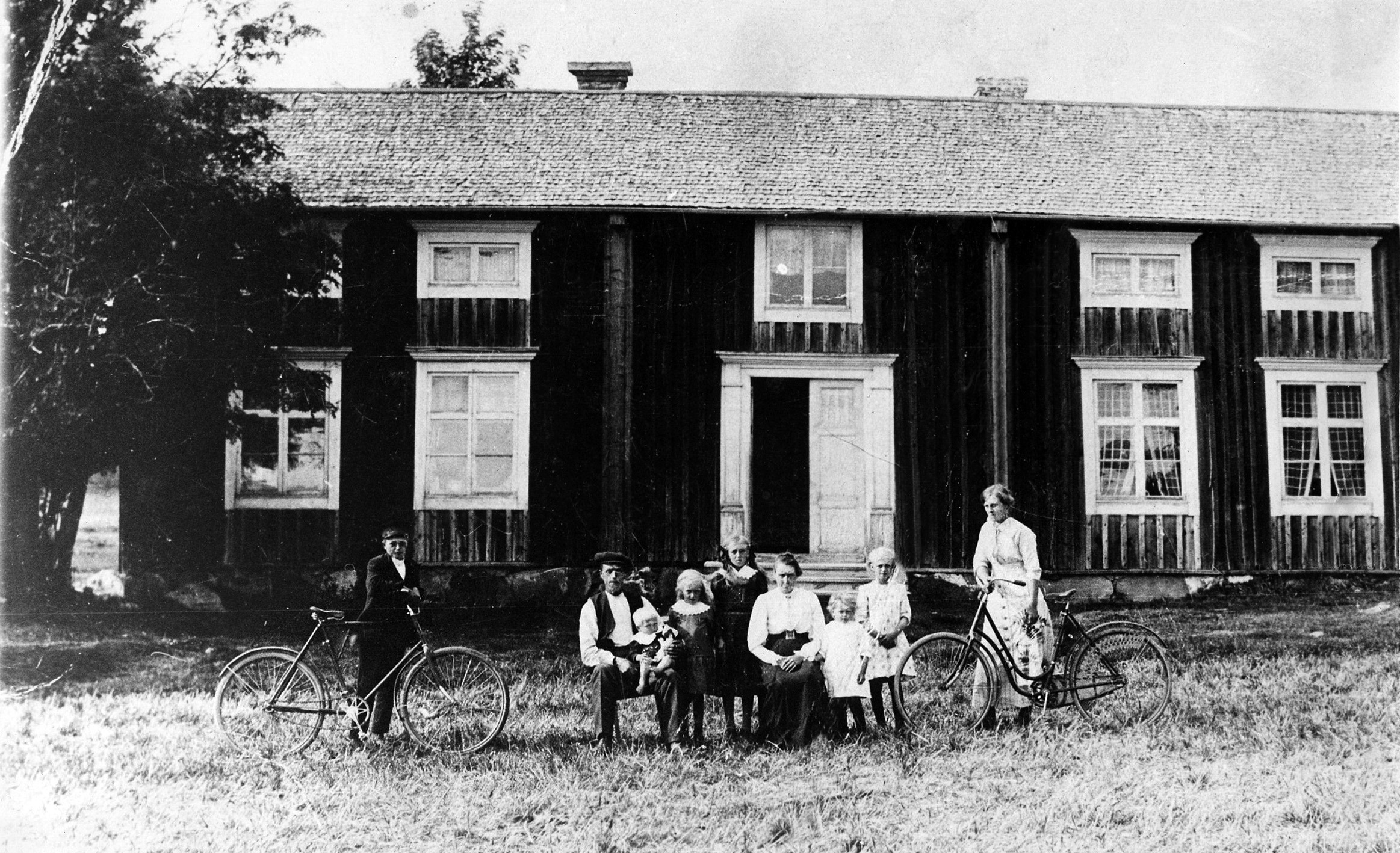 Knut Viklund, 1902-1983, håller i cykeln och till höger sitter hans farmor Johanna Ulrika Efraimsson, född Andersdotter ( f. 1841), Teresia Efraimsson (f.1881) och Efraim Pettersson, Knuts pappa, (1863-1943). Bilden troligen tagen på Önnesmark 2:13 omkring år 1910.