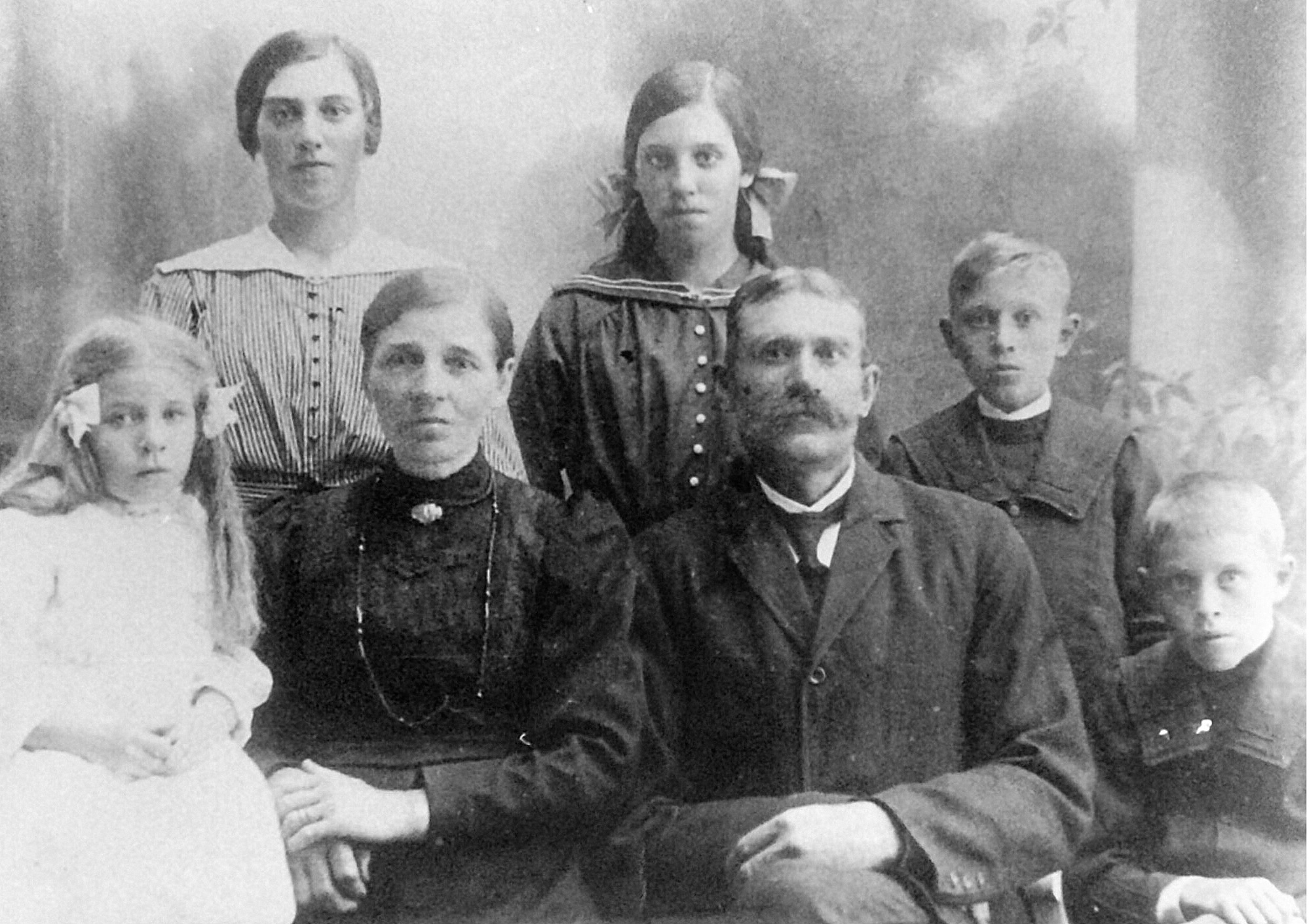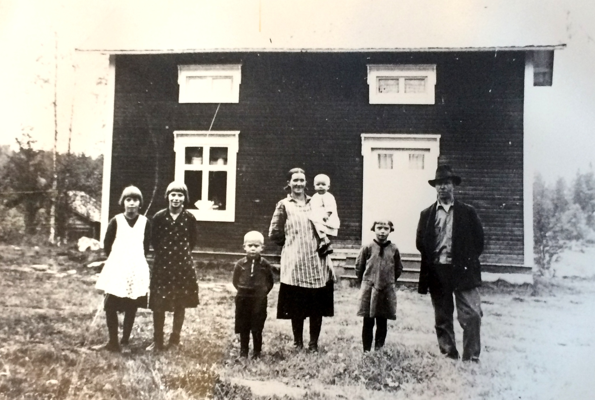 Gustav Mattson, f. 1875, och makan Catharina Högmark, f. 1866 med barnen Maria, f. 1901, Emelia f. 1903, Linnea, f. 1913, Gunnar f. 1905 och Verner f.1907. Landet/Landsjön, Önnesmark 2:4 (Bild 6:77)