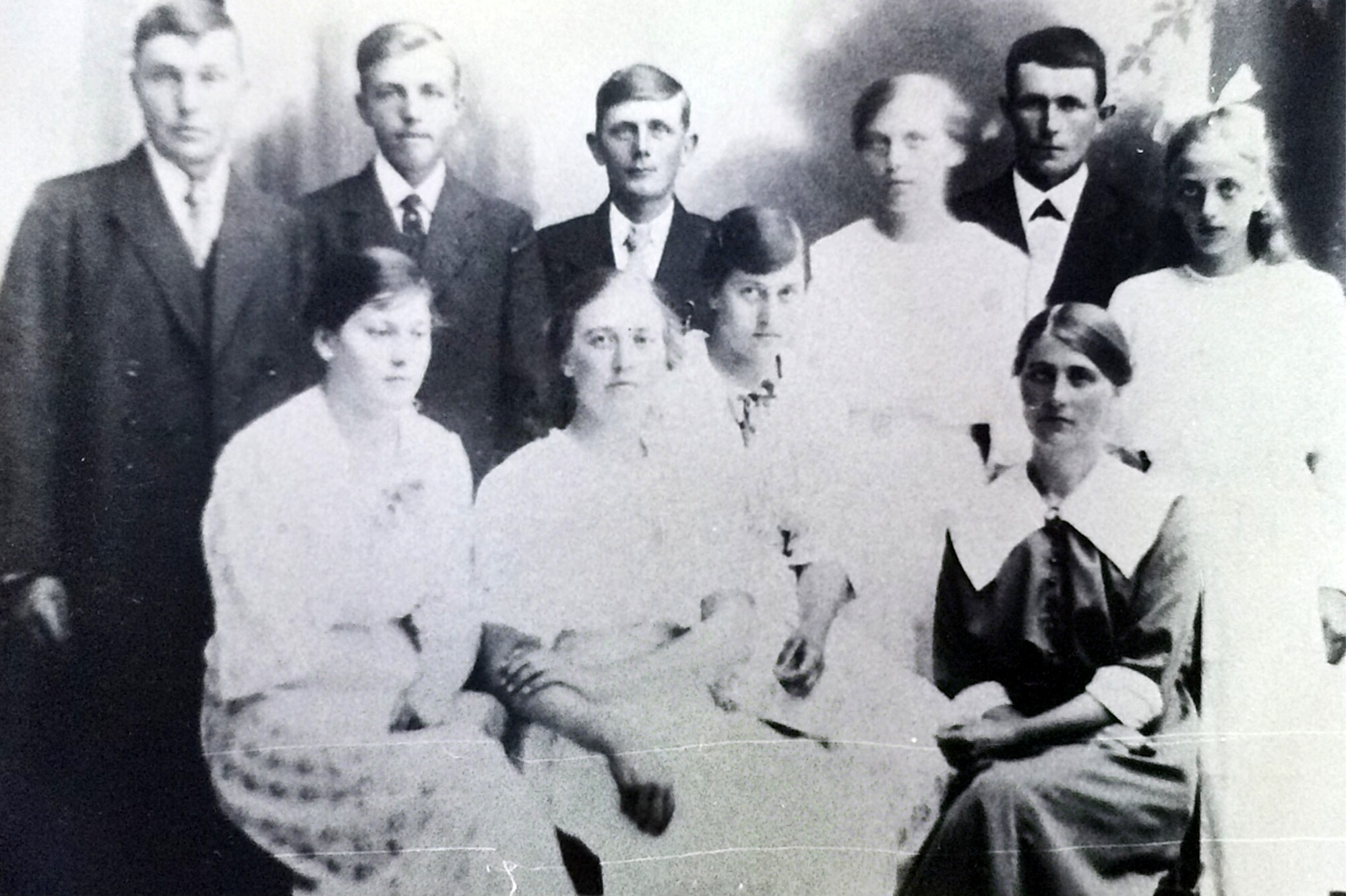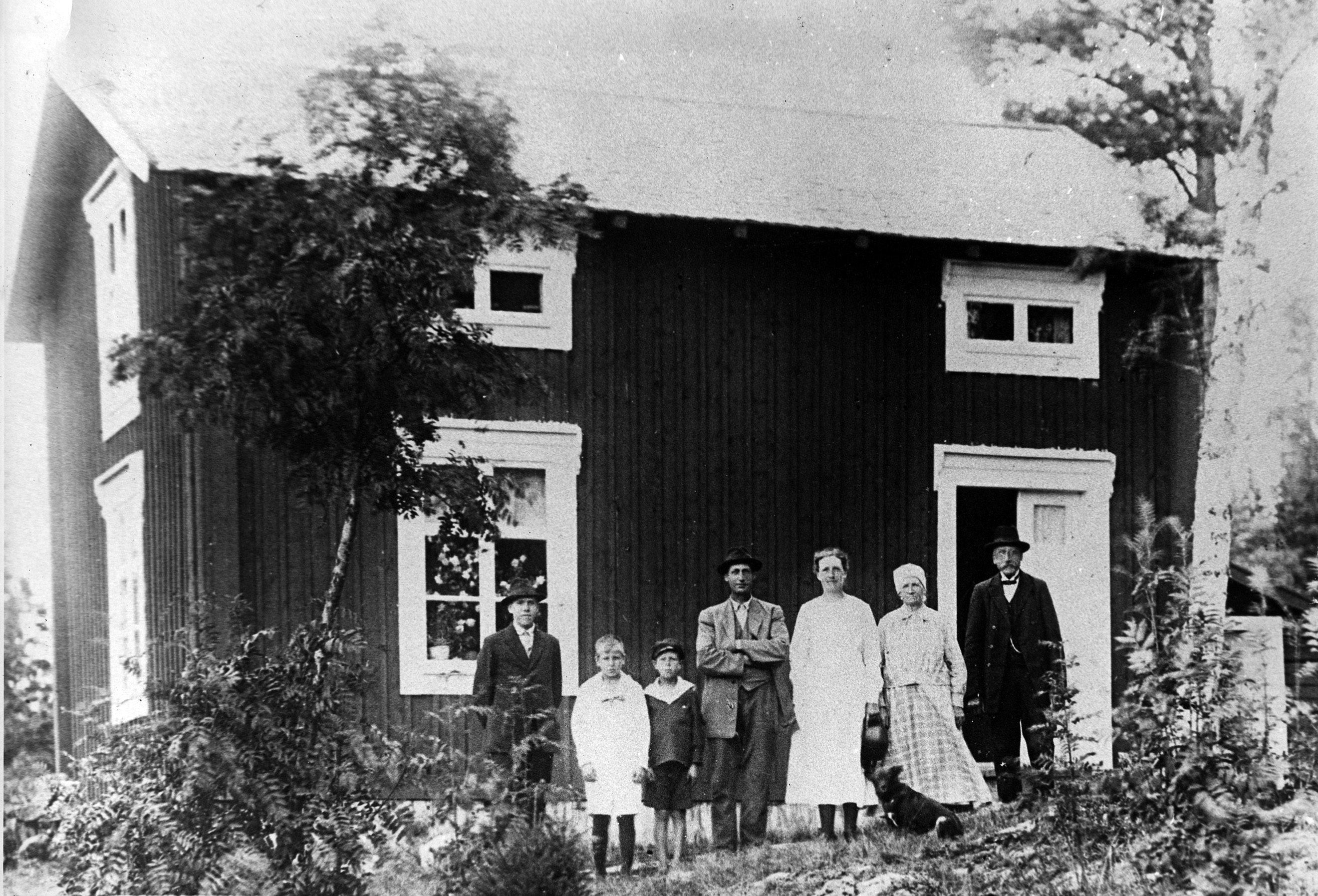 Fritz Granlund, Bror Persson. Peder Andersson, okänd kvinna, Arvid Gabrielsson, syskonen Henny Persson, Anna Persson, Beda Persson, Hildur Andersson.